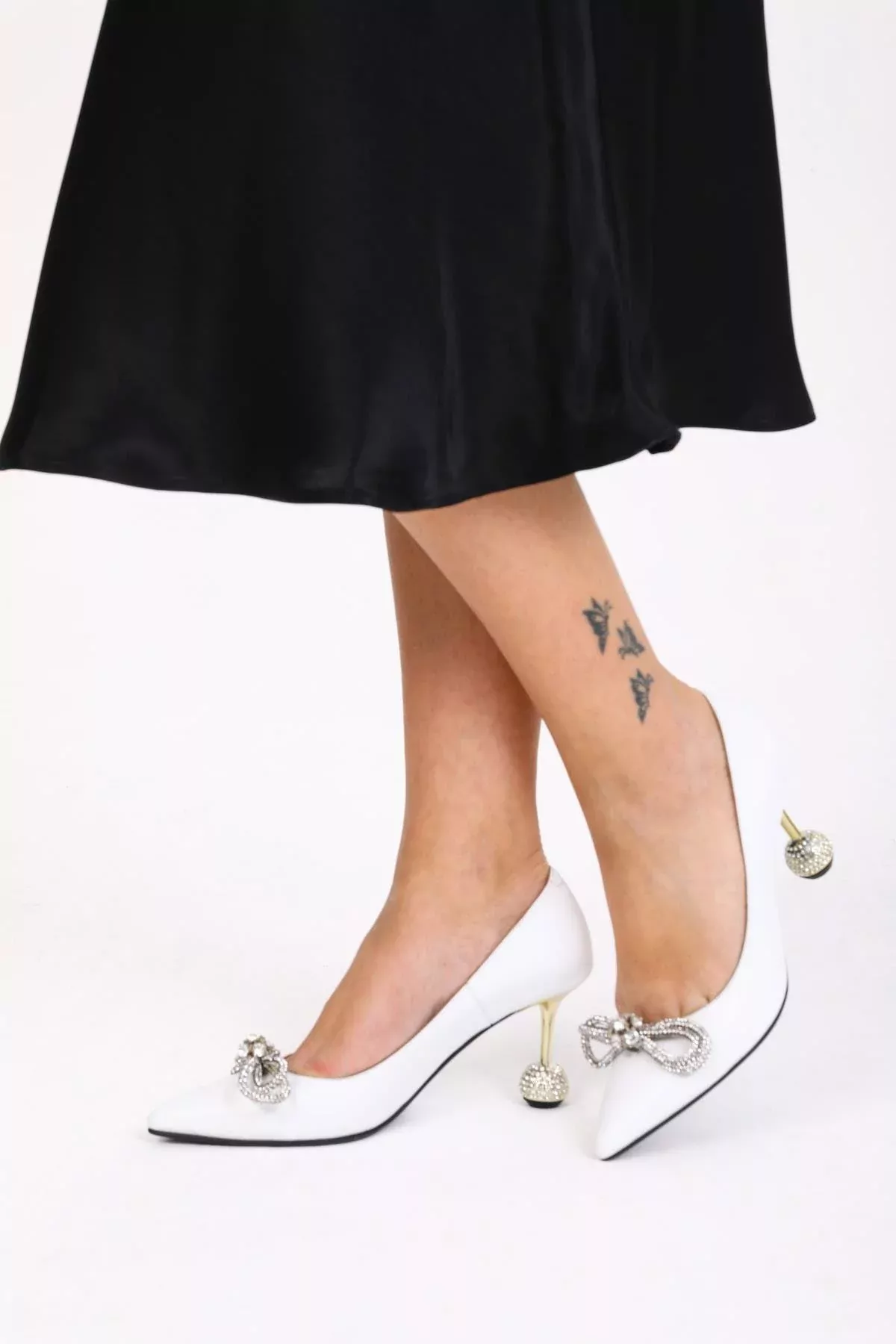 Kadın Beyaz Deri Topuk Ve Aksesuar Detaylı
