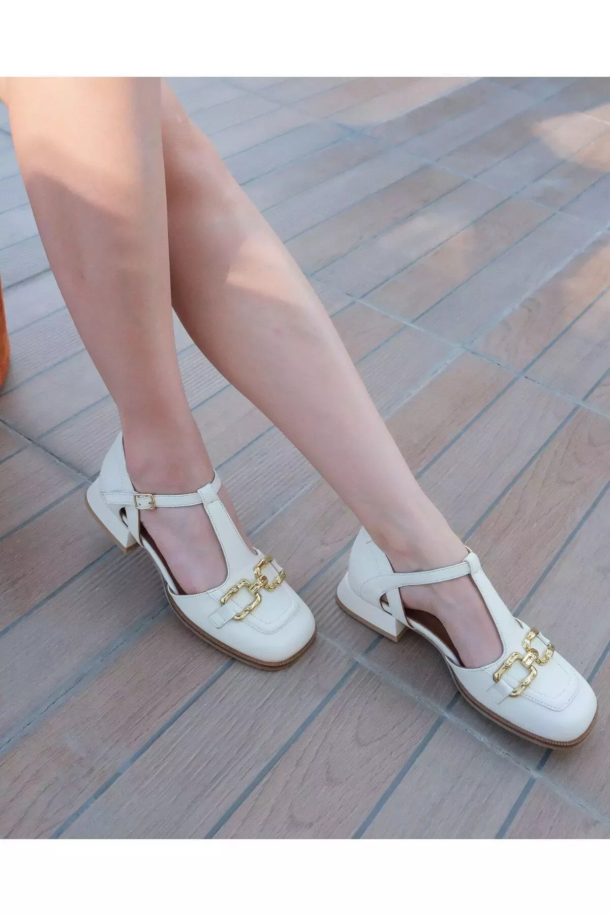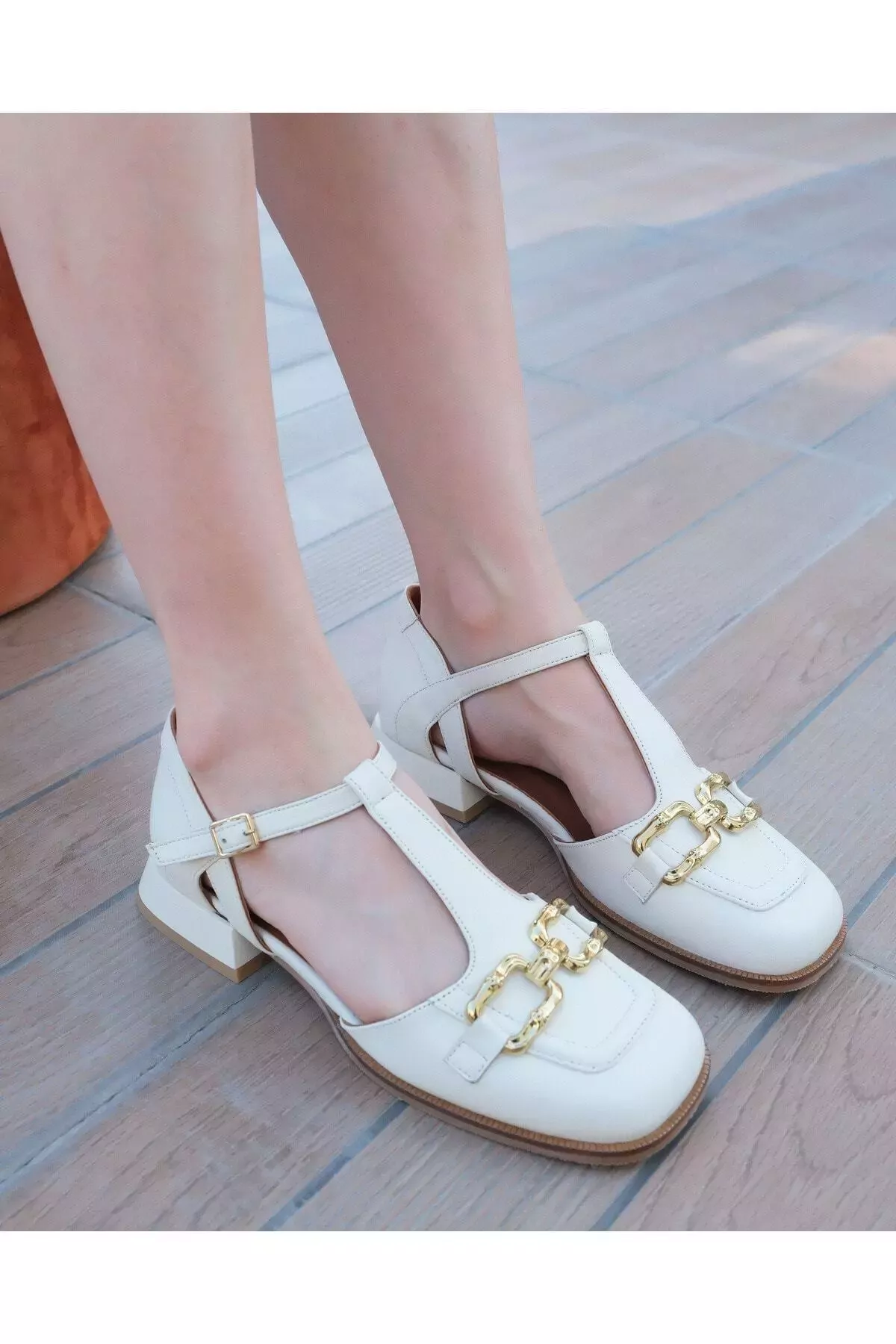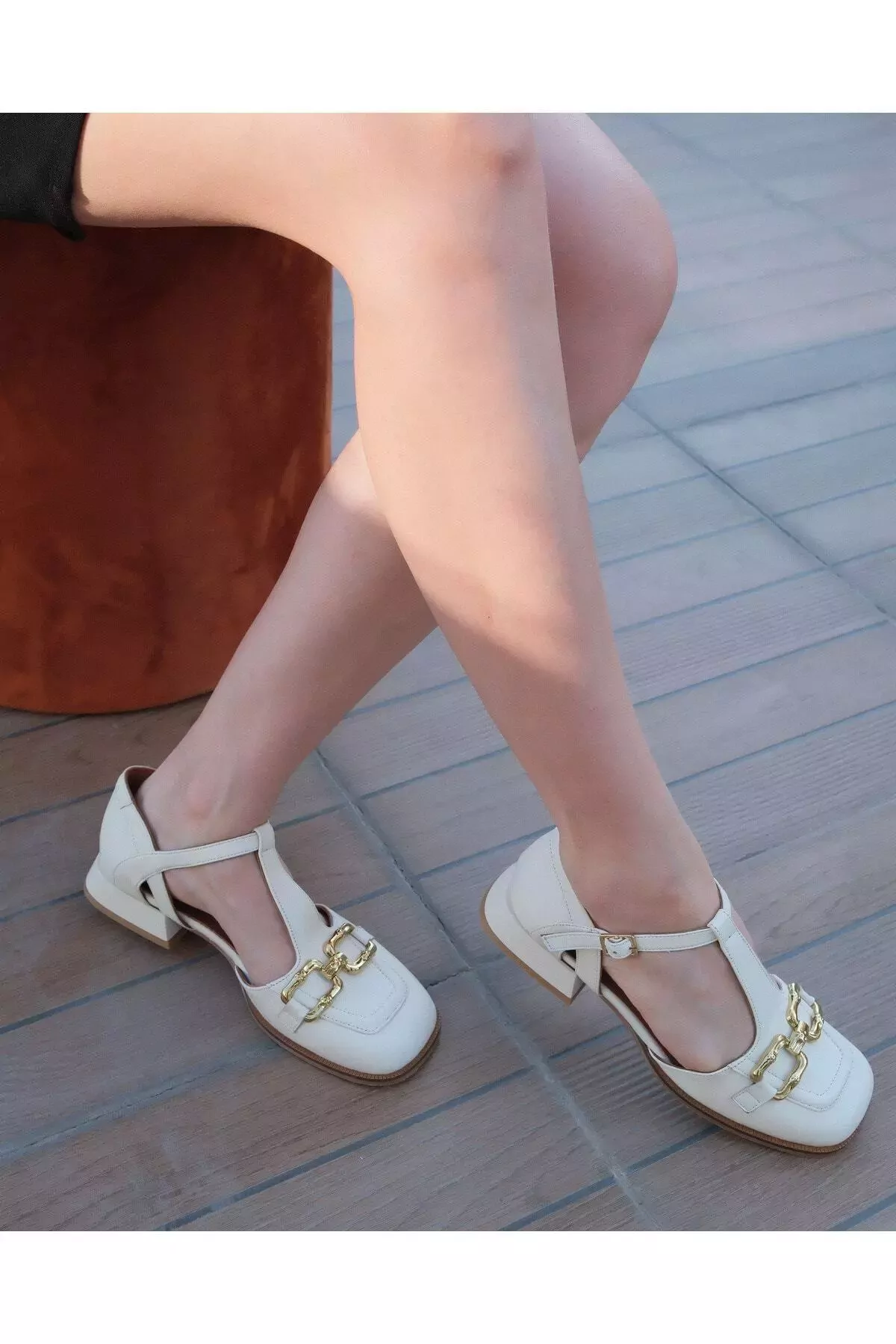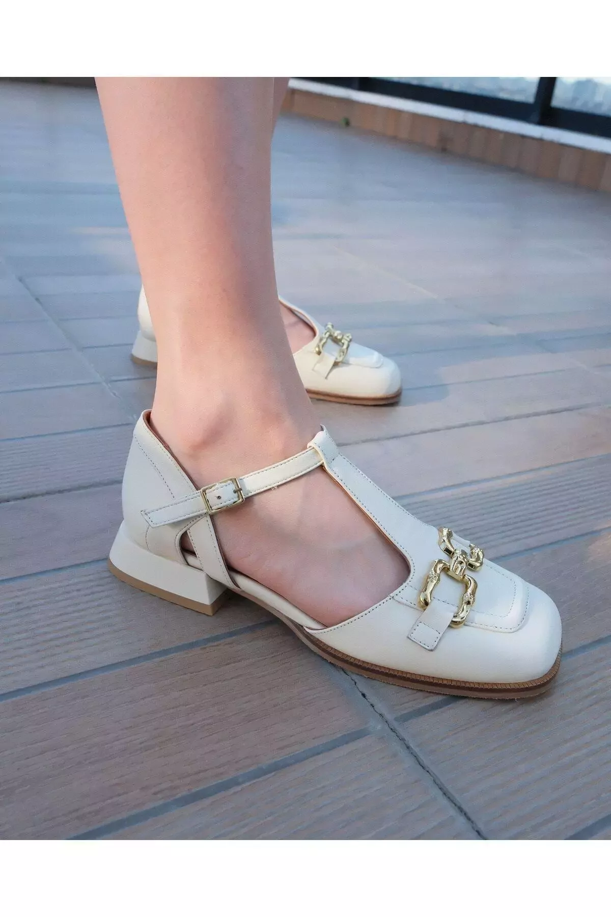 Kadın Deri Sandalet Aksesuar Detaylı Krem