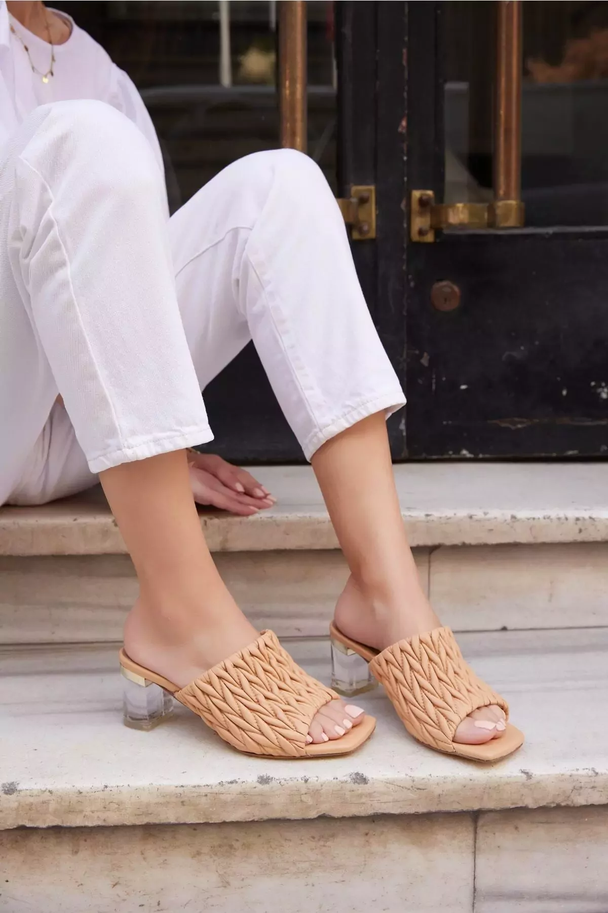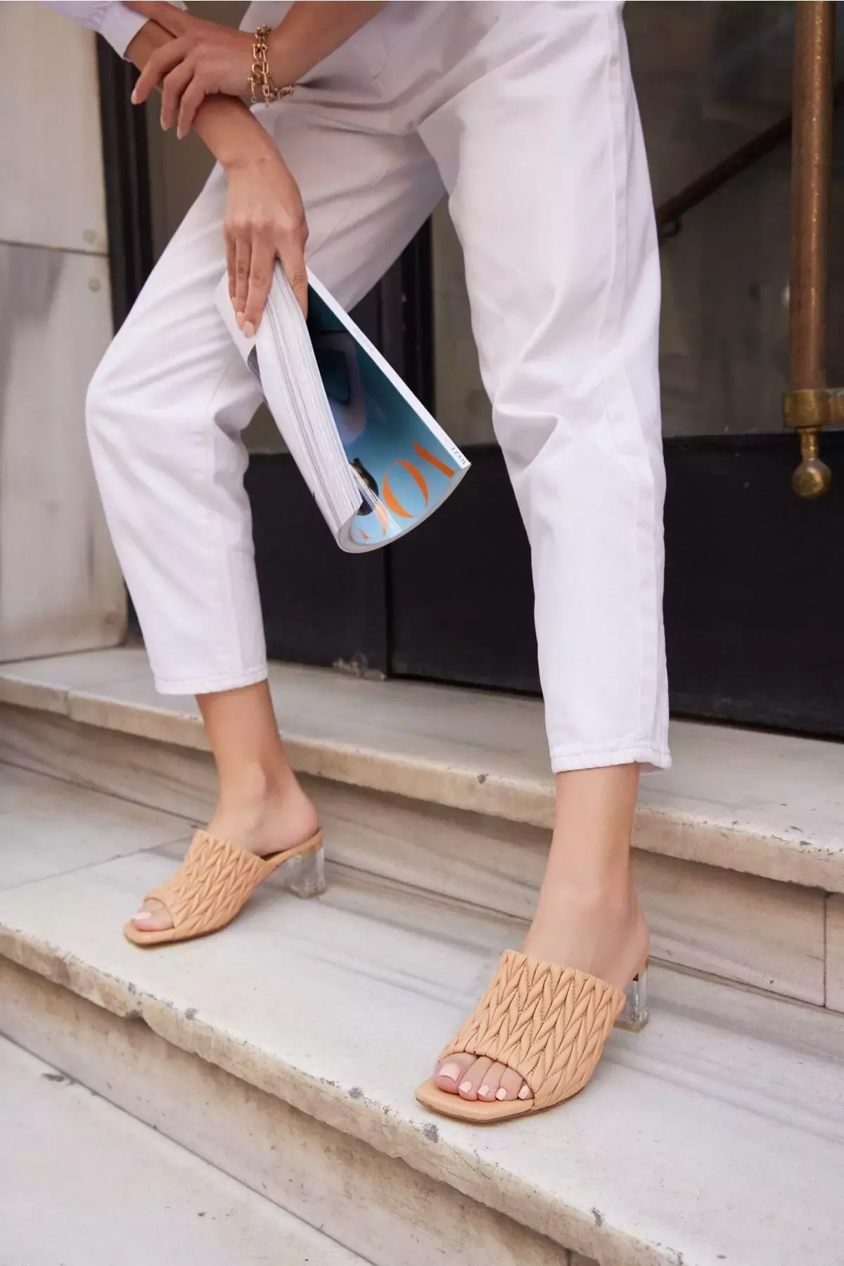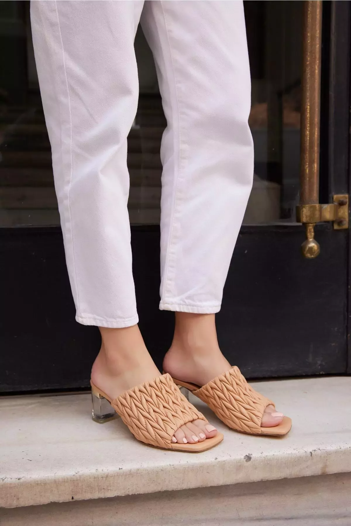 Kadın Koyu Krem Hakiki Deri Topuklu Terlik