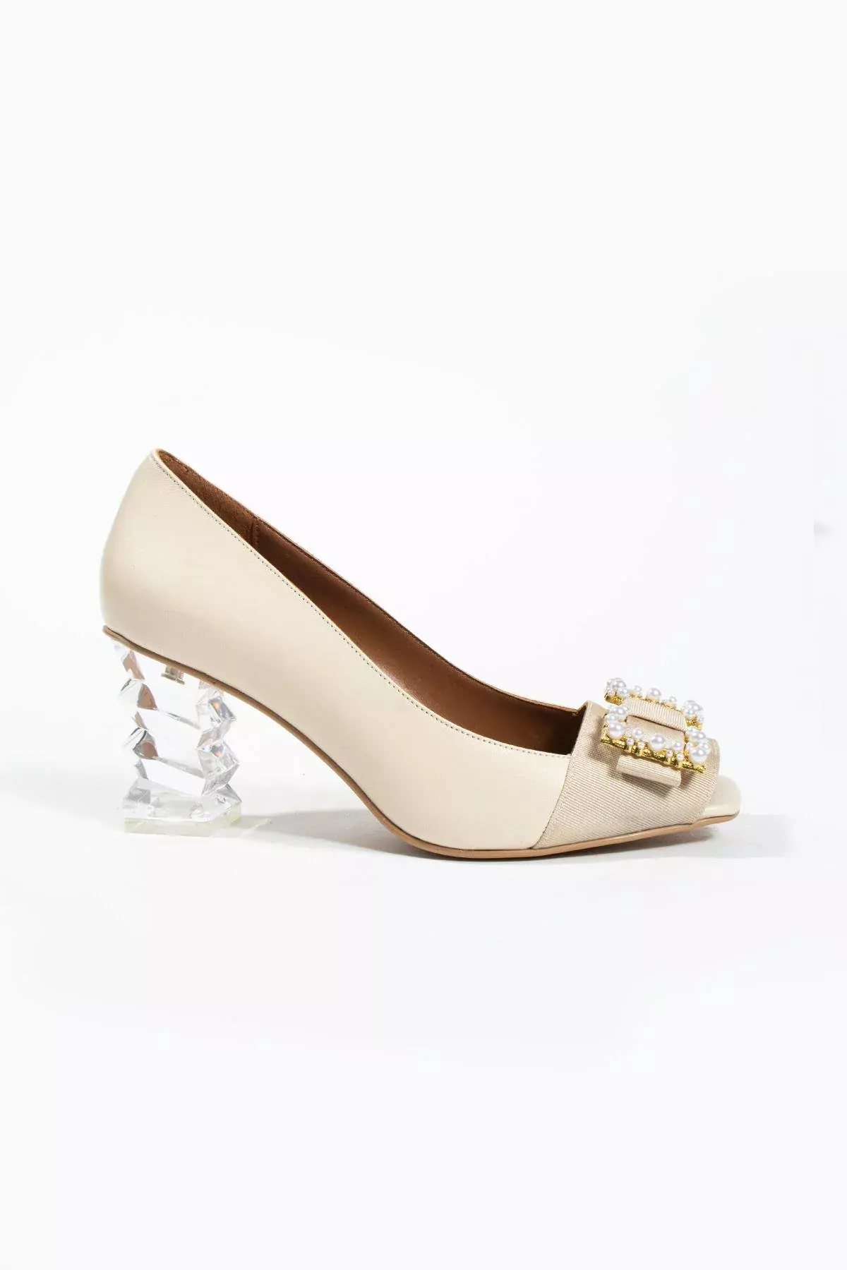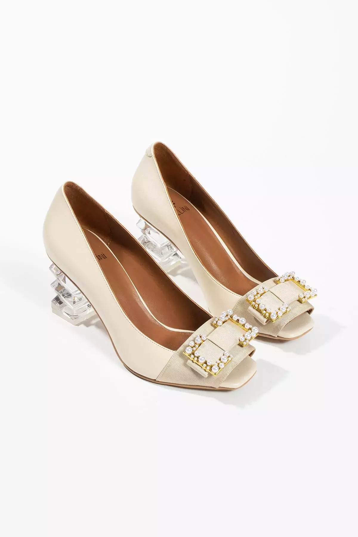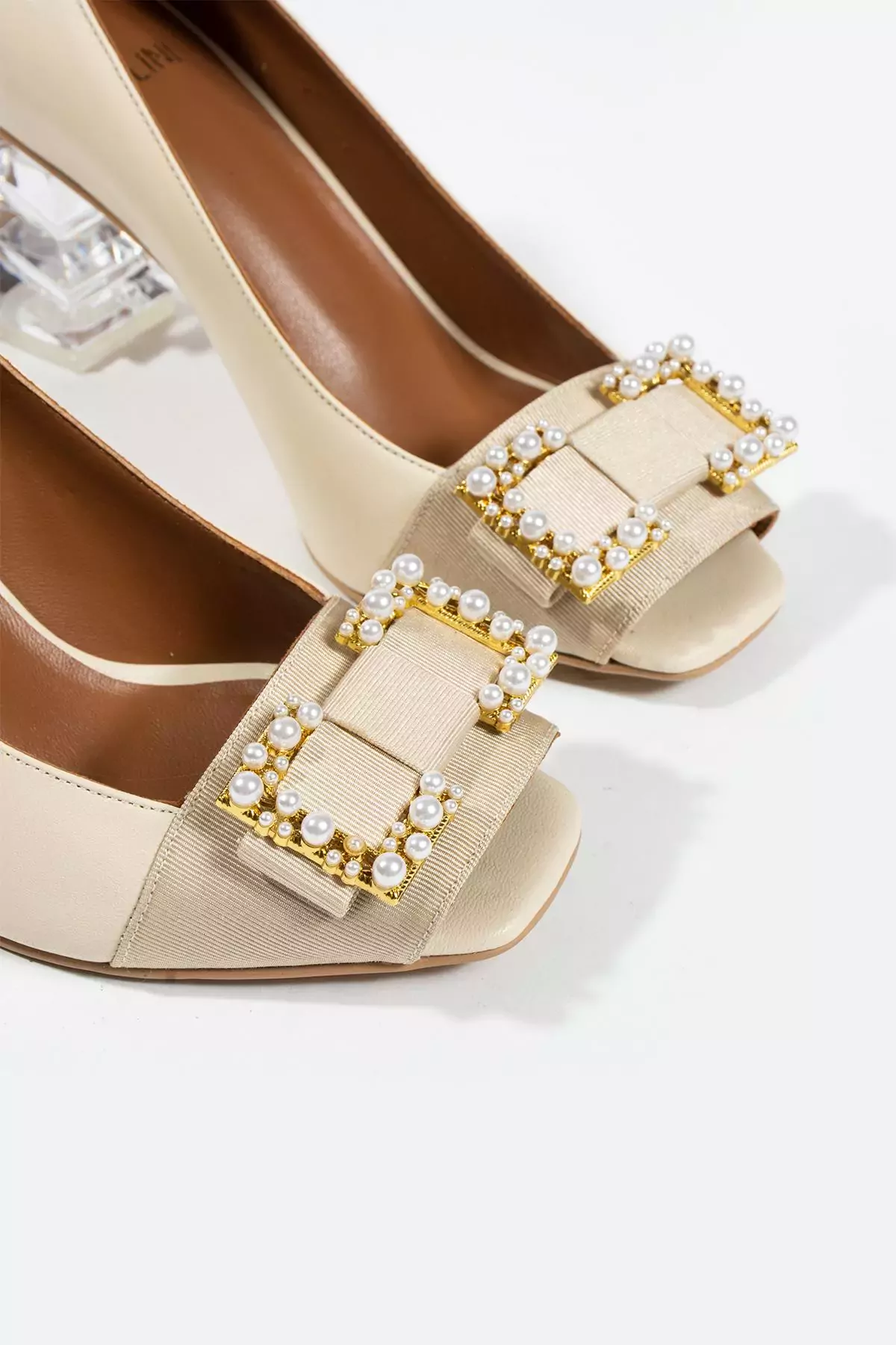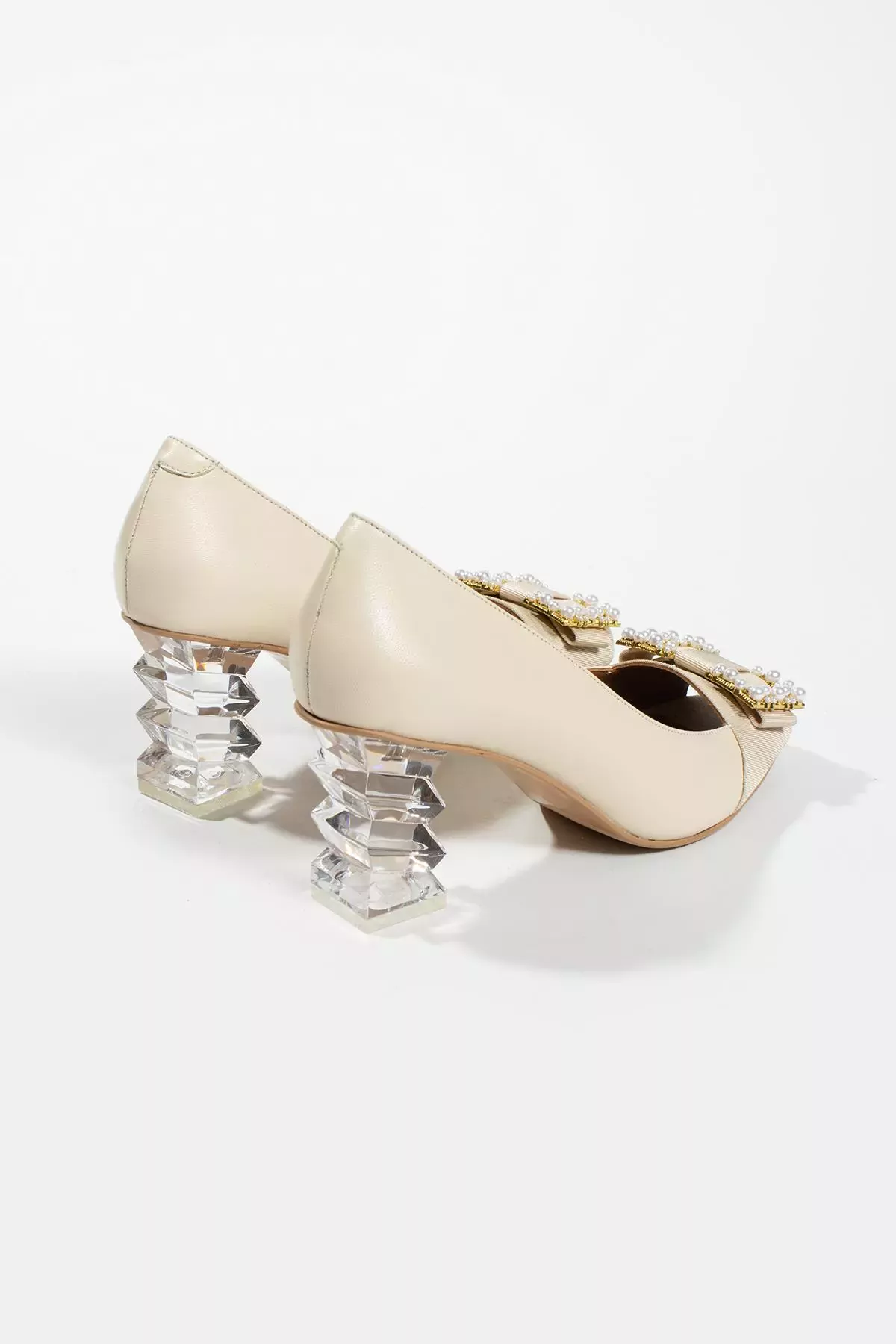 Kadın Krem Hakiki Deri Aksesuar Ve Topuk Detaylı Topuklu Ayakkabı