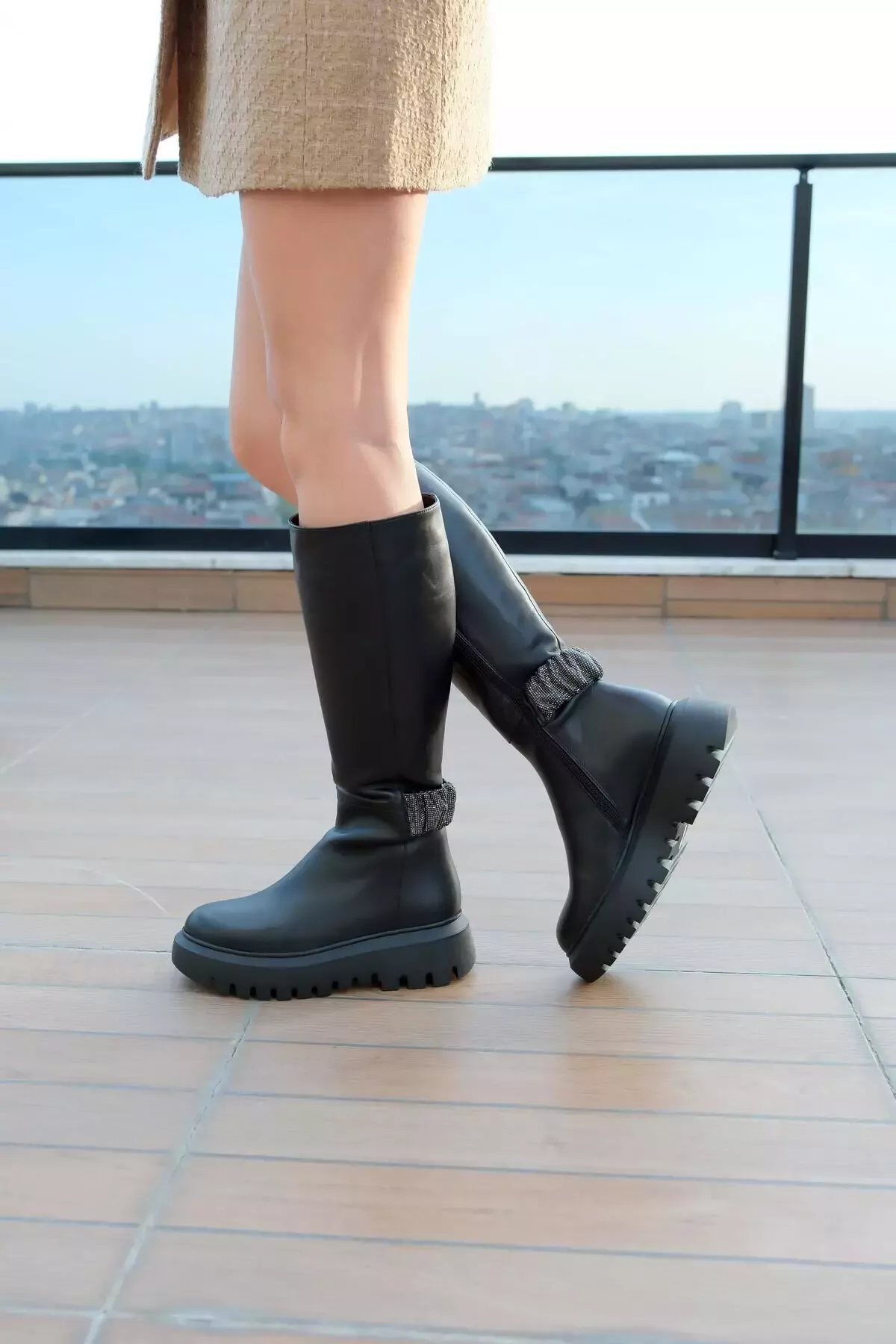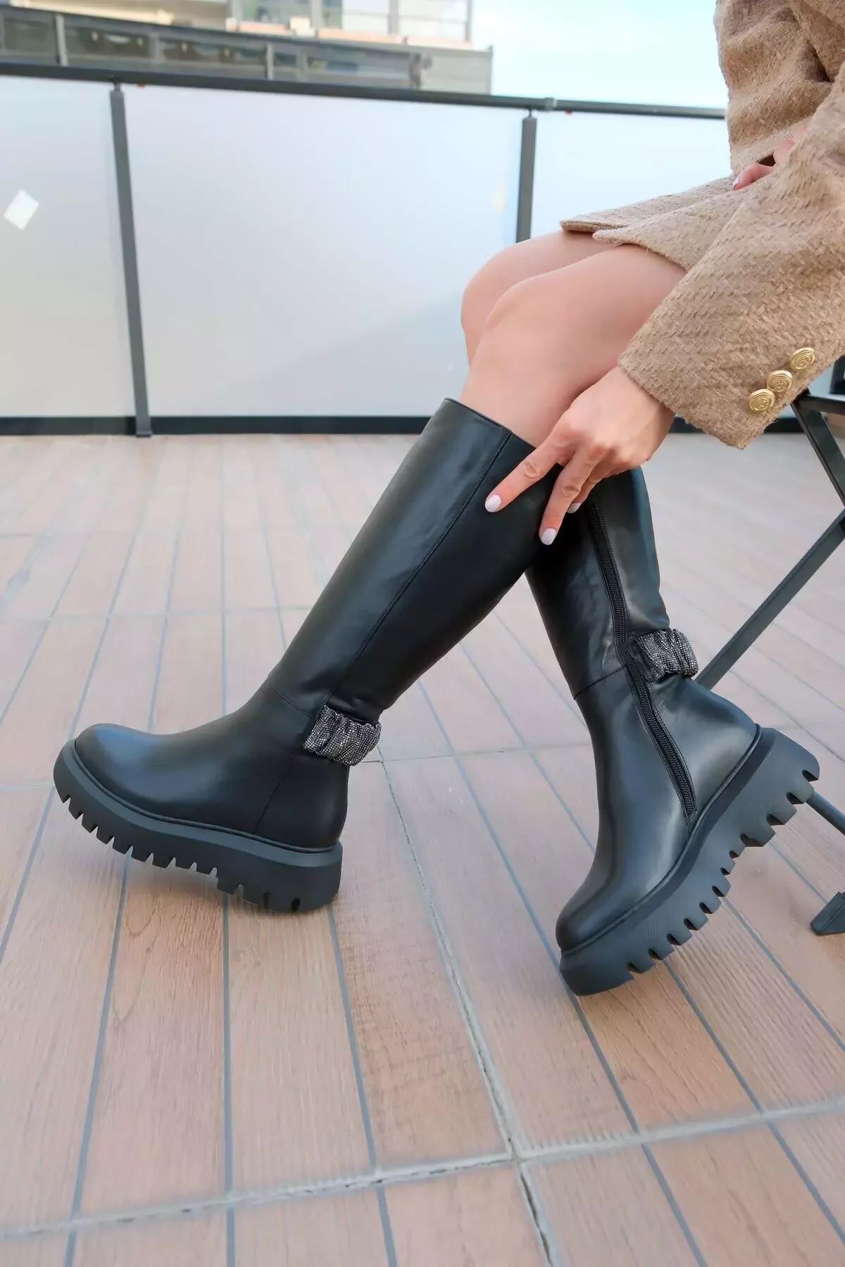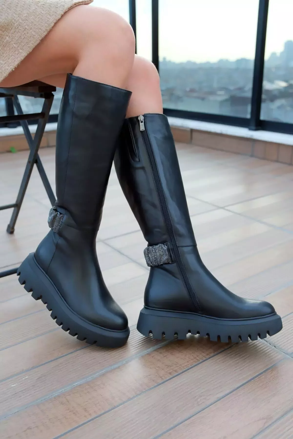 Kadın Siyah Hakiki Deri Taş Detaylı Çizme